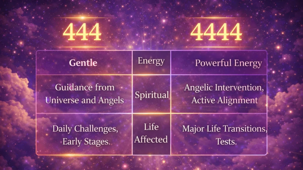 444 and 4444—both the angel numbers represent the energy of the number 4, but the difference lies in terms of intensity, spiritual depth, and practical impact. Let’s break down why the angel number 4444 is far rarer and more profound.