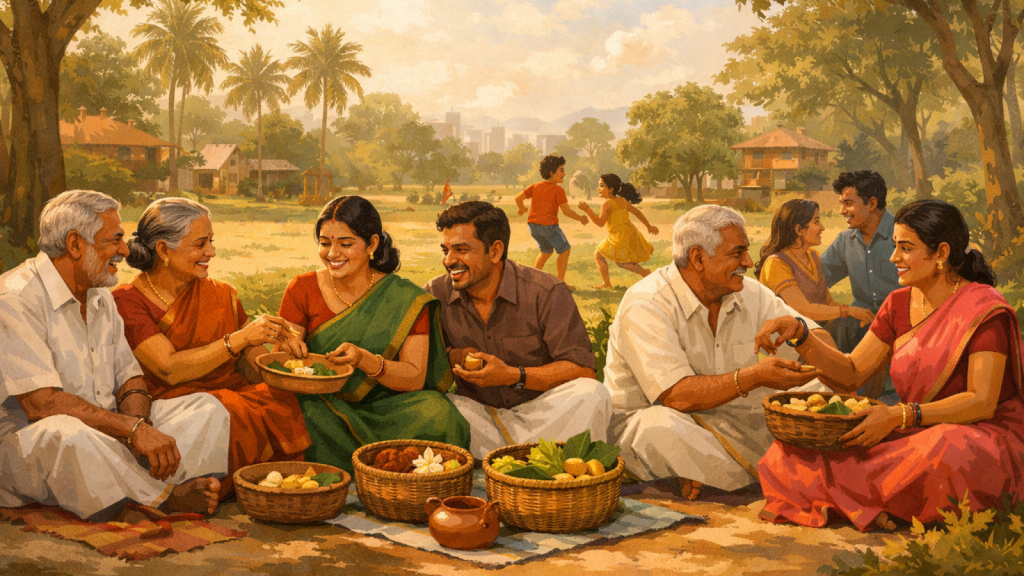 Kaanum Pongal is the fourth and final day of the Pongal festival. This day is mainly about family, relationships, and spending time together. After the main rituals of the first three days, Kaanum Pongal is more relaxed and joyful. On Kaanum Pongal, people visit their relatives, friends, and neighbours. Many families go out for picnics to parks, temples, riversides, or beaches. Sisters pray for the well-being of their brothers, and families exchange gifts and food.
